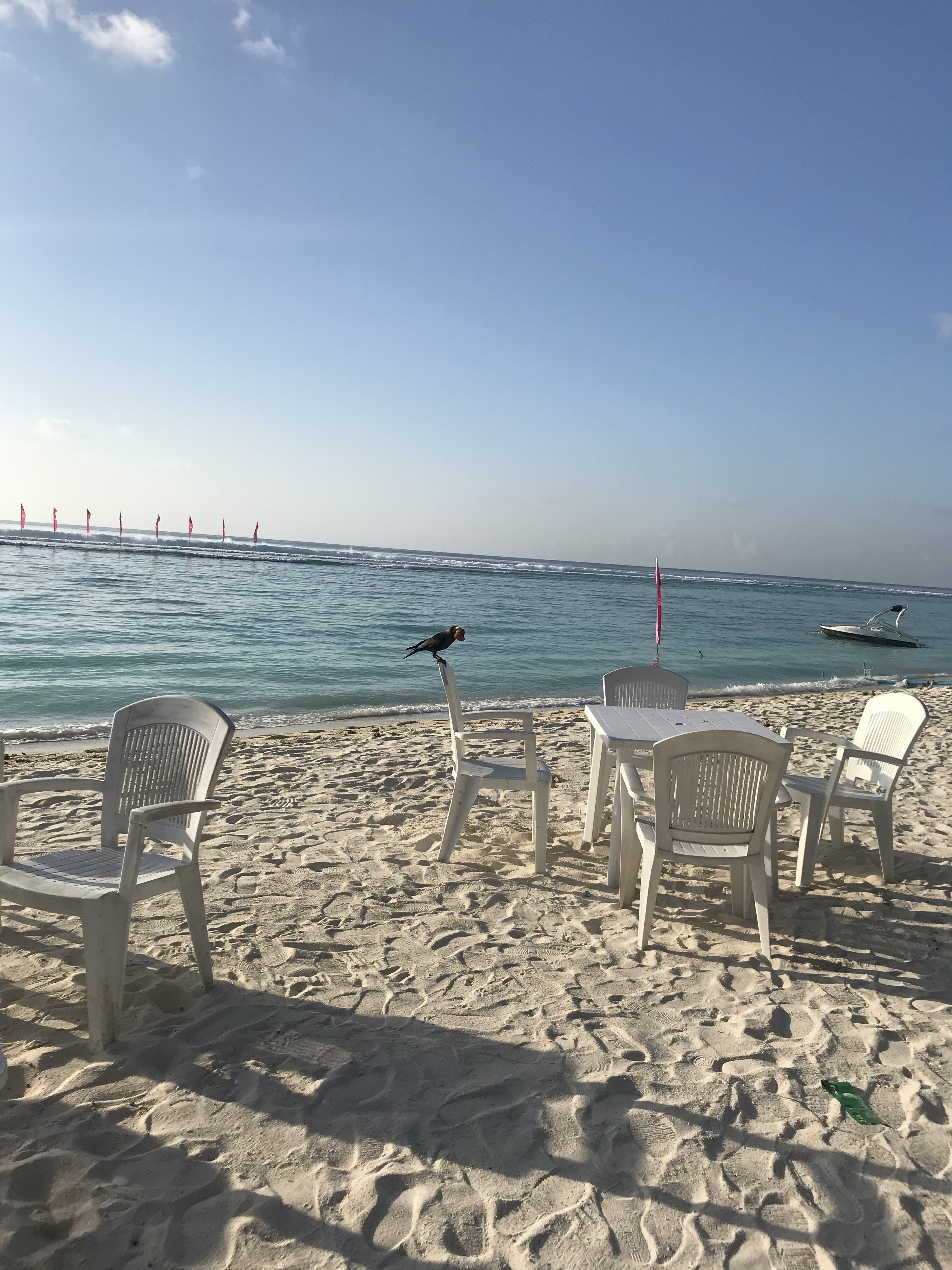 On the beach are chairs and tables where customers could enjoy their food, with the ocean as the backdrop and the sound of the tide washing up on the white shoreline.